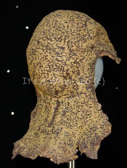Description: A latex appliance featured in various episodes of Star Trek: Enterprise. The Suliban are a nomadic humanoid species from Sector 3641 featured mostly as antagonists primarily in the first two seasons. This impressive Suliban head piece was used to create the Suliban appearance on the show; it is made of textured latex and painted light-tan and darker brown to give the stippled effect of Suliban skin.
