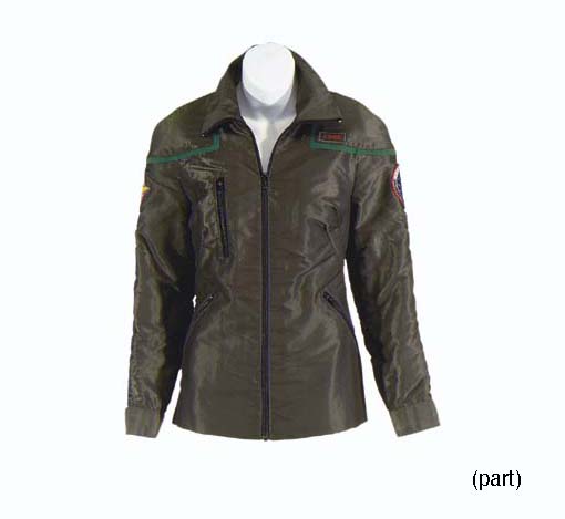 Description: Two grey, collared, lined nylon jackets, each with an embroidered <I>Enterprise</I> mission patch on the left shoulder and a Starfleet arrowhead patch on the right shoulder, one has mustard/gold shoulder stripes and an embroidered name badge, "Archer," and the other has blue/green stripes and an embroidered name badge reading "T'Pol" -- worn by Scott Bakula and Jolene Blalock as Captain Archer and T'Pol in <I>Star Trek: Enterprise</I> (2)