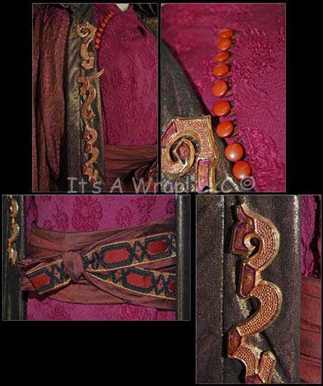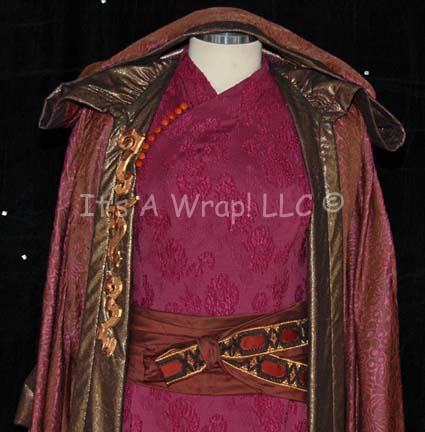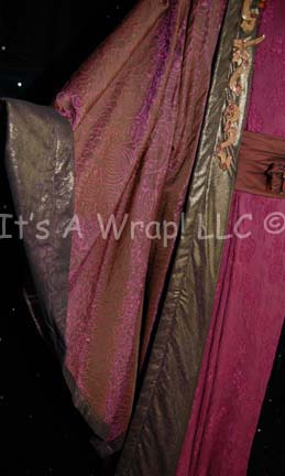 Description: A set of beautiful female Vulcan robes featured in the Star Trek: Enterprise episode “Kir‘Shara” for wear by Kara Zediker in her role as “T’Pau” following her ascension to being a minister in the new Vulcan government. The costume is composed of a full length long sleeved dress and an elaborate robe. The dress is purple texture thistle patterned fabric and is made with an asymmetrical front to appear double-breasted and features static buttons at the top right, though a zip runs up the spine, there are buttons at the cuffs, ; a slit runs vertically within the pleated folds of the dress on the right side seam under the buttons, there is no indication of damage or purpose. The robe features a green iridescent interior lining with a with a purple and rust colored floral pattern exterior, has kimono style sleeves with weights in the bottom of the cuffs, and is adorned with large sized pin backed Vulcan jewelry made from gold colored metal with amber colored ‘gems’ set into them shaped into familiar Vulcan iconographic symbols. The symbols in their configuration are represented in one resource as (from top to bottom) ‘concept, discipline, process’; their Vulcan terms being ‘rata tafar tapan’. Also, it is stated that a poetic form may be associated to their joining ‘Branches entwined form the tree’. Additionally the costume comes with a wide iridescent purple belt that features gold, black, and rust colored trim. The dress features a sewn in Enterprise tag reading ‘Kara Zediker’, the robe features a sewn in Enterprise tag reading ‘Kara Zediker 084’ and the belt features a sewn in Enterprise tag reading ‘Fionnula Flannagan #023, Kara Zediker #084, C. Front’. The costumer’s tag is nearly identical to the tag in the belt but indicates ‘Enterprise, Vulcan’. Star Trek veteran actress Fionnula Flanagan portrayed the Vulcan “V’Lar” in the first season Star Trek: Enterprise episode “Fallen Hero”.