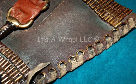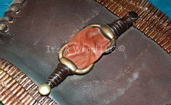 Description: A pair of costume gauntlets made for wear by Joanna Cassidy in her portrayal of “T’Les” in the Star Trek: Enterprise episode “Awakening”. The items are brown painted leather with tan interiors, metal chain-like trim on the front and ends with metal design embellishments on the outer wrists. The items are created to appear laced but are in fact sealed by Velcro. Interior labels read ‘Joanna Cassidy’.