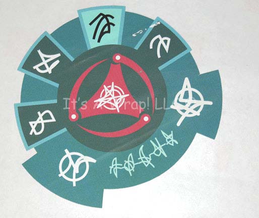 Description: A screen used graphical application appearing variously in episodes of Star Trek: Enterprise. The item was carefully removed from a case used to store kemocite in the Star Trek: Enterprise episode “The Shipment”. It is a circular shaped application with a varying green hued design and depicts multiple Xindi icons with the logo of “Gralik Durr’s” (John Cothran Jr.) mining consortium in the center. The item is presented on white wax coated paper and depicts a single scratch on the face of the graphic. The item measures approx. 6 X 6 inches.