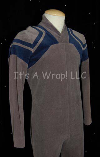 Description: A costume featured in the Star Trek: The Next Generation episode “Quality of Life”; wherein “Commander Data” (Brent Spiner) believes a machine called the “exocomp” to have gained sentience and refuses to sacrifice them for other sentient lives. This costume is that of one of the technicians aboard the station where the experiments for the “Particle Fountain” are taking place and consists of a long-sleeved, full-length, gray jumpsuit in a soft material with dark-blue stripes around the shoulders and clasps and a zip down the back. A sewn in Voyager tag denotes reuse on that series and reads ‘Mike McNett’ and a costumer’s tag reads ‘TNG #235 Quality of Life’.