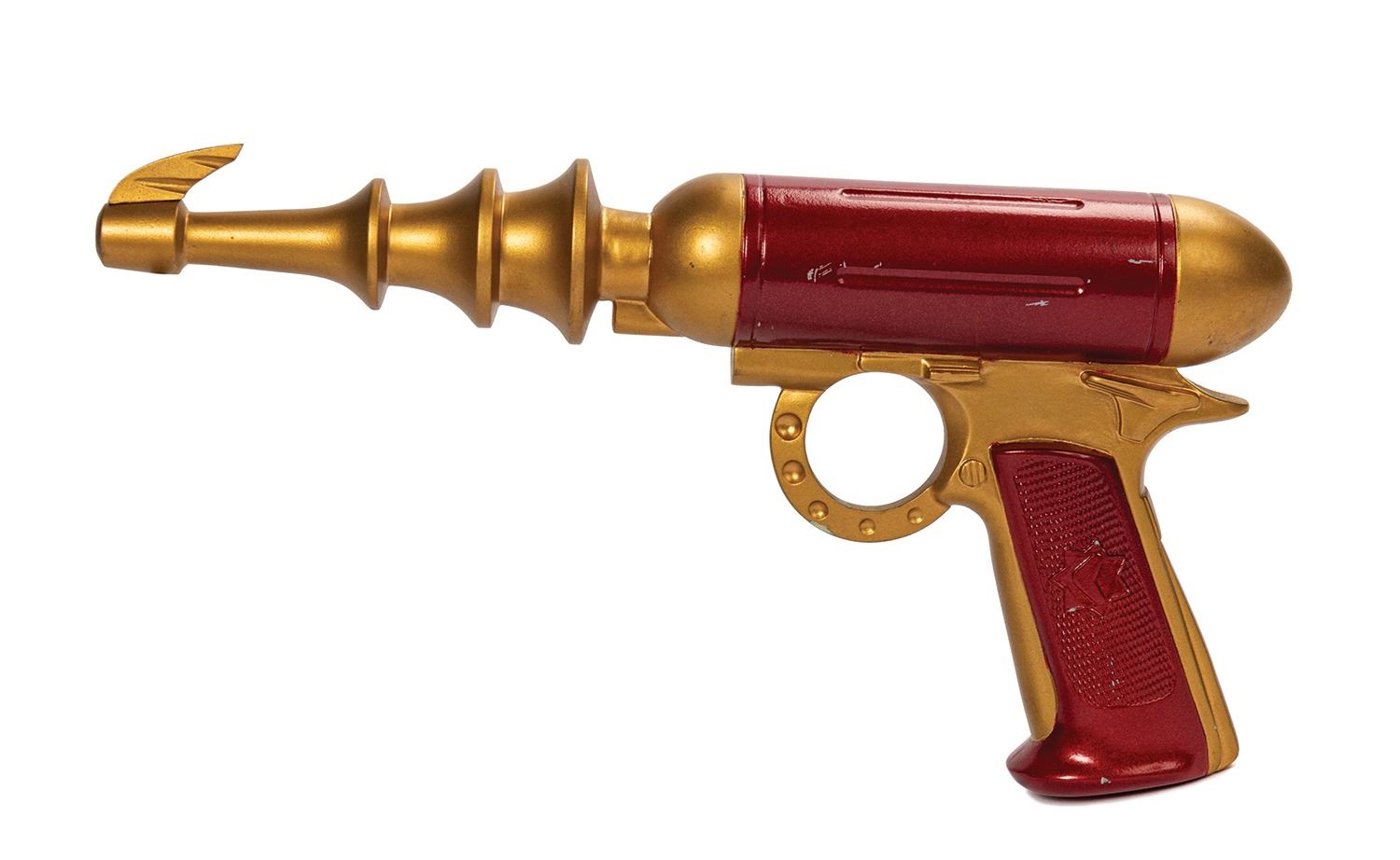 (Paramount TV, 1994-2001) Gold and red-painted molded resin made in the “Flash Gordon” style for the fifth season episode “Bride of Chaotica” and used by Tuvok during the holodeck simulation scenes. However, this prop is not seen in the final cut of the episode. It is the only one made … |