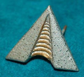 STAR TREK: “ENSIGN” RESIN RANK A resin rank badge made for characters portraying a lieutenant in various Star Trek feature films. The item is made from molded resin to appear as a downward pointing metallic silver colored triangle with a beveled triangle in the center, painted metallic gold with etched … |