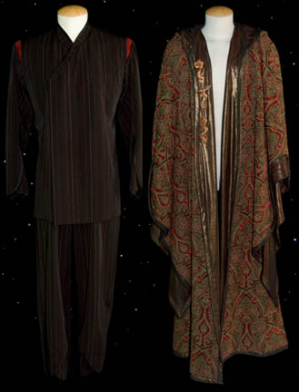 A Vulcan costume with robe featured in the Star Trek: Enterprise episodes “The Forge”, “Awakening”, and “Kir'Shara”. The costume is a set of black pin striped trousers with a matching long sleeved jacket top with an asymmetrical double breasted front that zips on one side and snaps on the other. … |