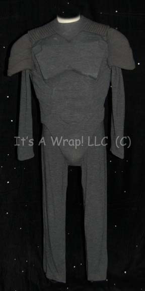A stunt costume featured in the Star Trek: enterprise episode “In a Mirror, Darkly, Parts I and II” for wear by “Dr. Phlox” during a fight scene taking place on board the “Starship Defiant”. The costume is faux reptile skin black leather trousers and a matching jacket with an asymmetrical … |