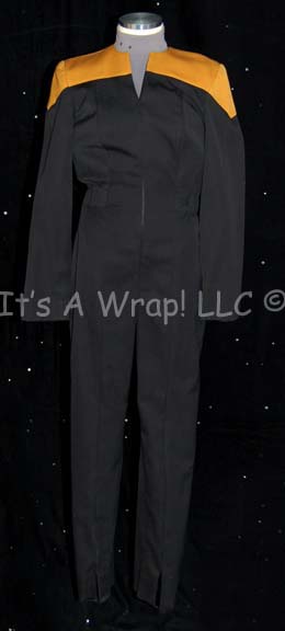A costume featured in various episodes of the first three seasons of Star Trek: Voyager for wear by Martha Hackett in the role of the Cardassian operative made to look Bajoran who later defects to the Kazon-Nistriim, “Seska”. This costume is her Starfleet uniform, a black jumpsuit with Operations Gold … |