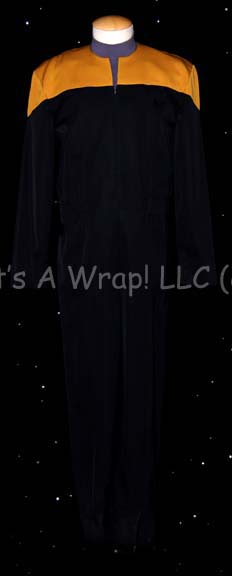 A costume featured in various episodes of Star Trek: Voyager for wear by Tim Russ as “Tuvok”. This costume is a black Starfleet uniform jumpsuit with Operations Gold division shoulders that zips up the front, clasps half way up the chest, and features a Velcro patch on the left breast … |