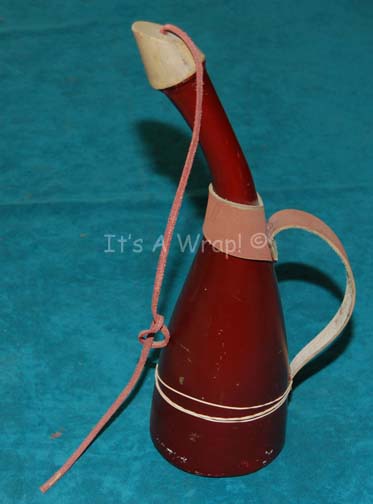 A prop Saurian brandy bottle like those appearing in the Star Trek: Deep Space Nine episode “Who Mourns for Morn”. The item is a solid cast resin prop painted rust brown with a tan faux stopper and multiple lengths of tan leather adhered. The item is believed to have been … |
