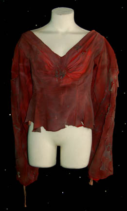 A rust colored costume top featured in Star Trek II: The Wrath of Khan. This piece was worn by stunt woman Ann Chatterton who played one of “Khan's” (Ricardo Montalban) genetically engineered superwomen. The item is a lace backed long sleeve shirt with a low cut neckline ending in a … |
