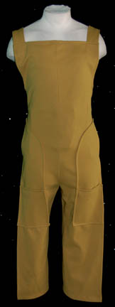 A pair of mustard colored overalls with Velcro enclosures for exposing the outside of the legs, functional pockets, and Velcro shoulder straps. The costume was meant for use in the ill fated Star Trek: Phase II which never made it to screen, yet elements of which eventually evolved into episodes … |