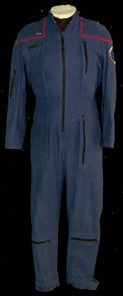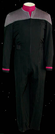 A Starfleet uniform in the style that made its first appearance in Star Trek VIII: First Contact comprised of a full-length black jumpsuit with gray quilted shoulders. The jumpsuit features black elastic stirrups at the feet, a form fitting elastic waistband sewn inside with attached loops for ‘away team' gear, … |