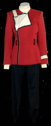 A Starfleet captain's uniform featured in Star Trek VII: Generations. The costume is black trousers with elastic ankle cuffs and red stripes down the outside seam of the legs with gold centered piping, a white command division long sleeved undershirt with a ribbed collar and cuffs, and a maroon officer’s … |