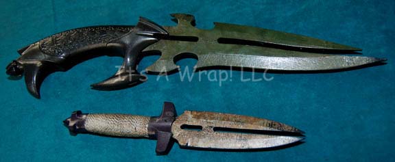 A lot of two differing Reman style knives like those featured in Star Trek X: Nemesis for use by “Shinzon” (Tom Hardy). The items are high quality molded rubber with metallic green painted ‘blades’. The smaller one is styled for use during the scene in which Shinzon draws his own … |