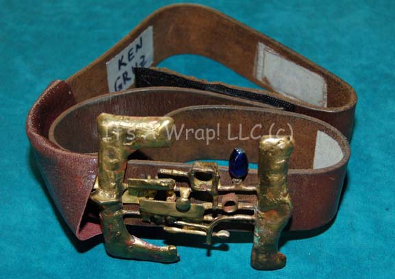 A Klingon themed belt appearing variously in Star Trek episodic television. The item is brown leather length with an artistic gold colored metal belt buckle. The buckle rests mid way around the leather as do many costume belts with a matching keeper to enclose the Velcro seal on the reverse. … |