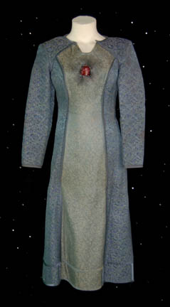 Worn by the third incarnation of “Ziyal” (Tracy Middendorf) in the episode “For the Cause” wherein the character was executed by “Damar” (Casey Biggs) for aiding rebels attempting to retake “Deep Space Nine” from the Cardassian-Dominion occupying force during the Federation-Dominion War. Two gold patterned blue dresses with two tone … |