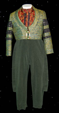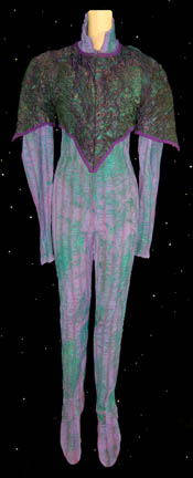 A full length jumpsuit with attached footies, made from purple fitting fabric with teal and gold splatter paint accents, with a shoulder wrap that zips on over the jumpsuit featuring similar paint accents on a dark crinkle fabric. Worn by actors portraying ‘Tail Headed Aliens' on the Promenade throughout the … |