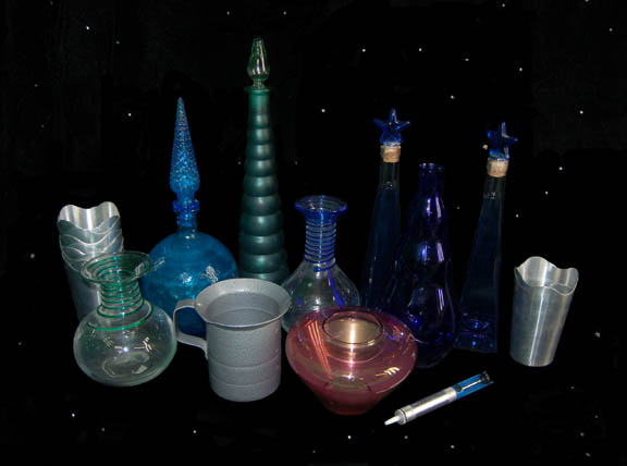 Discovered in a box inscribed ‘Kira's Quarters’, this lot of glassware, metal cups, and a Klingon mug comprise what may have been softer side of “Deep Space Nine’s” fist officer “Major Kira” (Nana Visitor). A green segmented vase with a stopper, a blue vase, a spiral necked vase with a … |