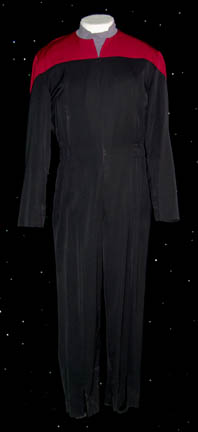 This Starfleet uniform jumpsuit is black with red command division shoulders that zips up the front and clasps at the top, half way up the chest, and features a Velcro patch on the left breast for a Starfleet ‘combadge' (sold separately). The waist features form fitting black elastic with sewn … |