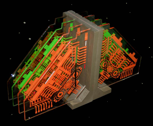 A collection of prop Cardassian circuit boards with stand. The circuit boards are made of clear acrylic plastic with orange, green, gold silk screened circuit art with metallic gold tape details. The frame is painted wood. The item measures approx. 20.75 X 11 X 7 inches. |