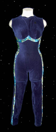 A blue ribbed velvet sleeveless jumpsuit with multi print green and blue trim that zips up the back and clasps at the top from the collection of “B'Elana Torres” costumes made for wear by Roxann Dawson in Star Trek: Voyager. |