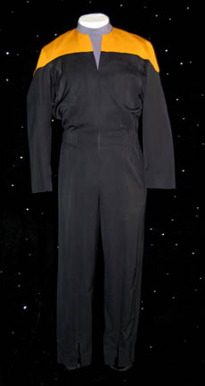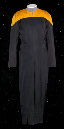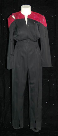 This Starfleet uniform jumpsuit was worn by Robert Duncan McNeil in various episodes of Star Trek: Voyager is black with red command division shoulders that zips up the front and clasps at the top half way up the chest, and features a Velcro patch on the left breast for a … |