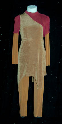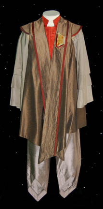 A Vulcan costume worn by LeRoy D. Brazile during his portrayal of a younger “Tuvok” in the episode “Gravity” of Star Trek: Voyager. We see this costume during flashback sequences involving Tuvok's training to suppress his emotions. It is made up of thin shiny beige colored pants with chevron cut … |