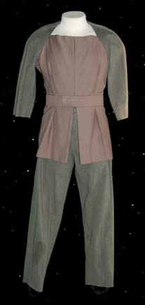 A two piece ‘Khazon' costume from the episode “Alliances” made up of dark gray pants with black elastic stirrups and suspenders, and a quilted uniform jacket that zips up the left side under the arm and features multiple differently sized rectangular shapes sewn in to create a patchwork appearance. The … |