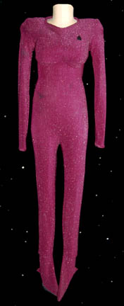A full-length purple form fitting “Seven of Nine” costume with sparkle accents throughout, attached footies with open heels for high heeled shoes, and a Velcro patch for a Starfleet combadge (sold separately). The costumer's tag reads ‘7 of 9, stunt double, distressed’, though thorough searching does not turn up any … |