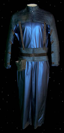 An intricate navy blue vinyl jumpsuit with matching gloves and a Velcro affixed shoulder and arm wrap made from neoprene that snaps into place around the arms and to a matching harness at the waist. Presumably used by Talaxian miners on an asteroid in the episode “Homestead” of Star Trek: … |