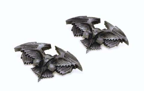 Two solid cast resin badges painted as gun metal, each with a sculpted image of the iconic Romulan bird-of-prey emblem, as redesigned for <I>Star Trek: Nemesis</I> -- <I>3½in. wide</I> -- used on a Romulan costume in <I>Star Trek: Nemesis</I> (2) |