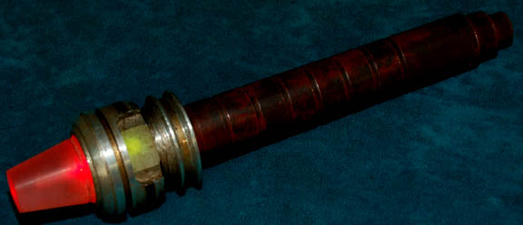 An electronic device made for used on Star Trek episodic television. Made of resin with a metal and acrylic tip, the handle is brown and the metal is intentionally distressed. A button on the bottom of the handle activates a red light in the tip and a green light on … |