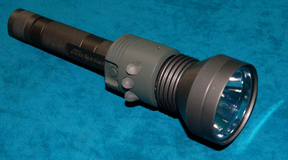 A prop item featured in Star Trek: Enterprise episodes like “Vanishing Point”. This prop item is a “Sure Fire”, high-powered, LED flashlight in gun-metal gray featuring a gray plastic housing added for the electronics of three light-blue LEDs near the front of the item and activated by the button behind … |