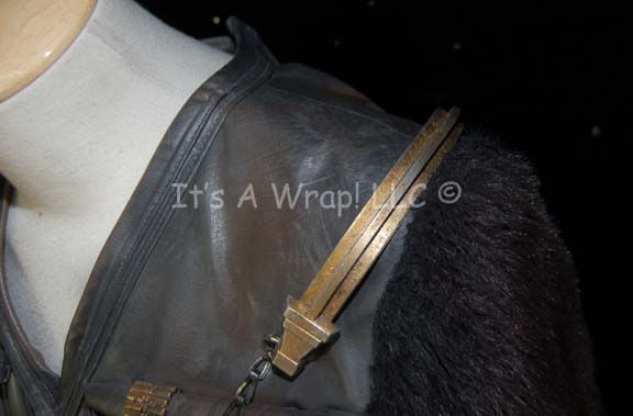 A Klingon costume similar to those featured throughout 24th century Star Trek episodic television and feature films. This lot consists of a gray, leather/vinyl pleated, jacket featuring textured, vertical stripes, a dark-gray, shoulder “armor” piece with diamond-shaped rubber detail, metal tabs, wood and metal accents on the chest; chain around … |