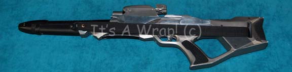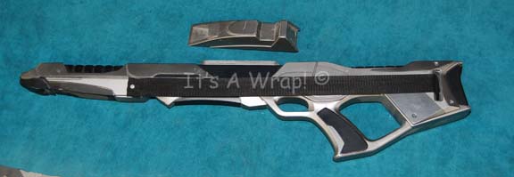 A prop phaser rifle like those appearing in Star Trek VIII: First Contact. The item is a Starfleet Type III Mark II Phaser rifle made from solid cast resin, painted metallic gunmetal with black painted accents and a statically mounted black nylon shoulder strap. The item depicts evidence of repair … |