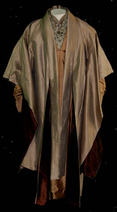 A set of robes featured in opening scenes of Star Trek X: Nemesis for wear by Romulan Senators. The costume is comprised of a gold colored under robe with zips at the cuffs and an affixed metallic square pattern collar, a matching mandarin style collar dickie, and an outer robe … |
