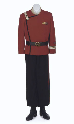 A <I>Star Trek II</I>-style Starfleet uniform, comprising: a burgundy jacket with black trim, cream-colored wrist band and shoulder strap, metal Starfleet chest insignia, sleeve and shoulder rank pins, and sleeve service pips, belt with Starfleet insignia buckle, with a pair of corresponding black pants, a cream-colored turtleneck shirt and a … |