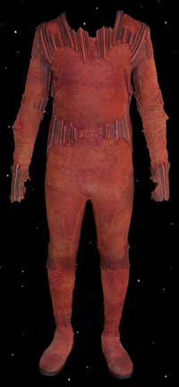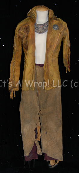 A costume featured in the second Star Trek feature film “The Wrath of Kahn”. This costume a pair of dark purple spandex pants covered in purposefully distressed appearing tan leather covering, and an orange spandex jacket with affixed distressed tan synthetic material. The jacket features a significant degree of distress … |