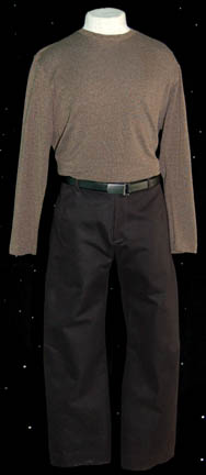 A costume featured in the Star Trek: The Next Generation episode “First Contact” for wear by Jonathan Frakes in his portrayal of “Commander Riker' while in disguise as a Malconian while on an anthropological survey of the nearly warp-capable species. The costume is blue trousers with a matching top featuring … |