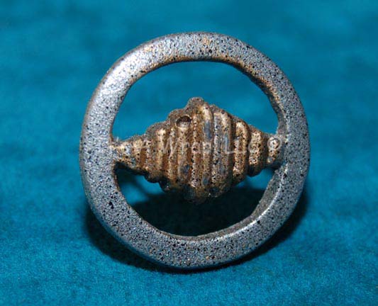 A molded resin rank accent for costumes appearing in various Star Trek feature films. The item is a small circle painted metallic silver and a gold painted diamond center piece. The item features metal wire glued to the reverse for attachment to a costume division strip and rank placements and … |