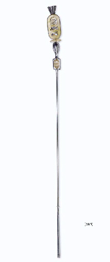 Two chromed metal staffs with simulated resin crystals and stones and Egyptian-style cartouches -- <I>94in. high</I> -- believed made originally for alien ambassadors in the San Francisco scene in <I>Star Trek: The Motion Picture</I>, later seen in the Fal-tor-pann scene in <I>Star Trek III: The Search for Spock</I> (2) |