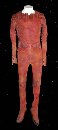 A one-piece textured Lycra jumpsuit, zipped up the back and colored in multiple shades of brown, orange and red. Painted cast latex piping has been attached around the shoulders, waist, elbows, wrists and knees to create the ‘Suliban' look. Thumbholes have been made in the latex at the bottom of … |