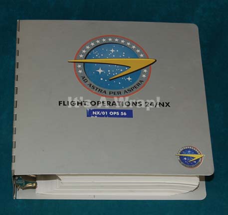 A prop technical manual like those appearing variously in episodes of Star Trek: Enterprise and specifically in the episode “First Flight”. The item is a metal covered three ringed binder with hinged covers and a 3.5 inch spine. The item is filled with blank white paper and several divider tabs. … |