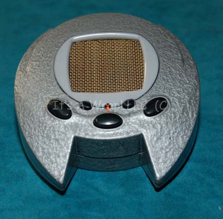 An injection molded plastic prop communicator featured in the Star Trek: Enterprise episode “Chosen Realm” for use by Triannon religious fanatics who hijacked the “Enterprise NX-01”, more specifically for use by their leader “D’Jamat” (Conor O’Farrell). The item is painted metallic silver and features a molded clip on the screw … |