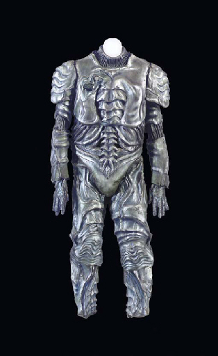Four heavy costumes comprising jackets and jumpsuits covered in sculpted, cast urethane with gloves painted silver-blue metallic -- featured as Hirogen uniforms in <I>Star Trek: Voyager</I> (8) |