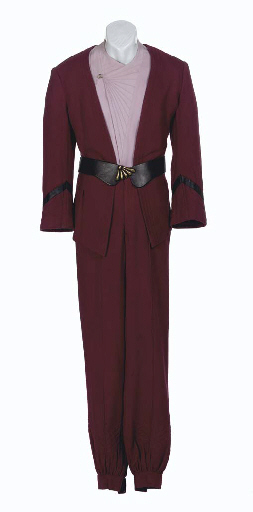 A brown imitation leather overcoat, burgundy jacket, pink shirt and burgundy pants, with belt and belt buckle, all with <I>Western Costume</I> label inside inscribed <I>William Shatner</I> -- worn by William Shatner in <I>Star Trek III: The Search For Spock</I> (5) |