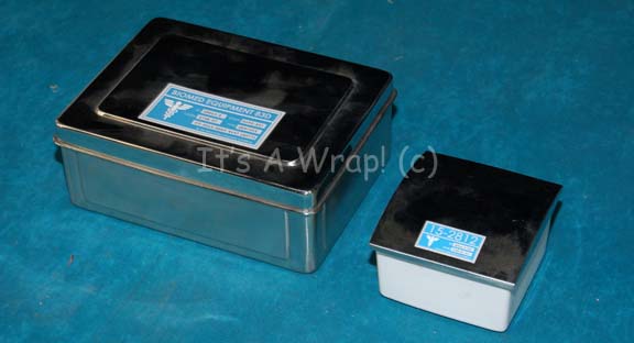 A pair of lidded boxes appearing as set dressing in the sickbay set in various episodes of Star Trek: Enterprise. The items are one metal container with a matching metal lid that features a blue colored Starfleet inventory application depicting a white cadesus and labeled ‘Biomed Equipment 83D’, and a … |
