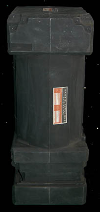 A black painted plastic cargo container used as set dressing on various episodes of Star Trek: Enterprise featuring well preserved ‘Material Supply Command' applications placed on the cylindrical portion of the item and one on either end of the item for a total of four. The item measures approx. 17 … |