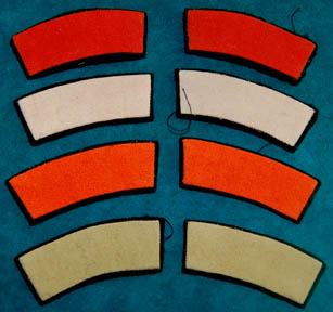 A lot of four sets of division-rank strips appearing in Star Trek feature films. The strips are colored fabric on black felt backings, the colors indicate the wearer to be a member of these divisions according to the coding for Star Trek I: The Motion Picture: command white, sciences orange, … |