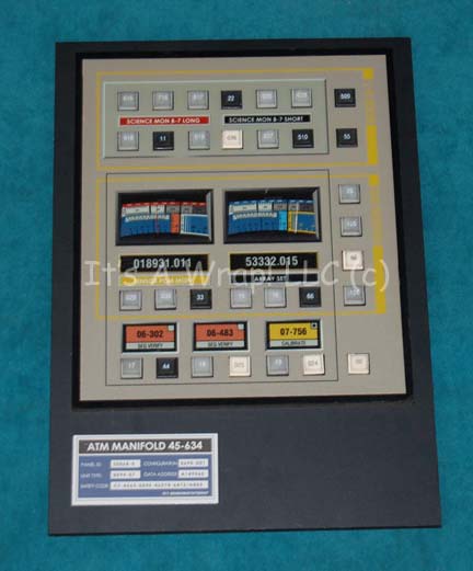 A piece of set dressing similar to those featured in various episodes of Star Trek: Enterprise. This item is a rectangular piece of sheet plastic featuring a graphical application, three vertically oriented, multi-colored, faux gauges with numerical values, multiple faux indicators on either end, rubber “buttons” also with numerical values, … |